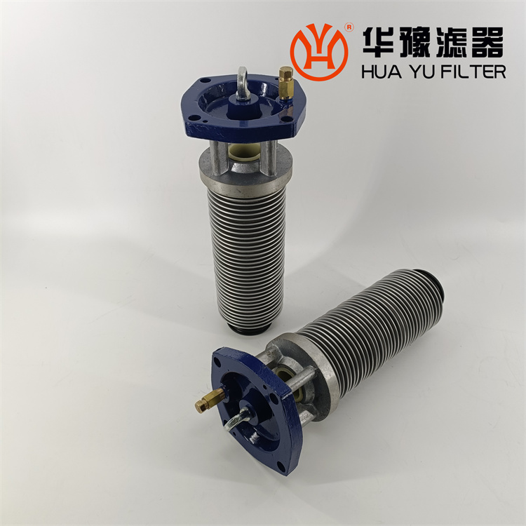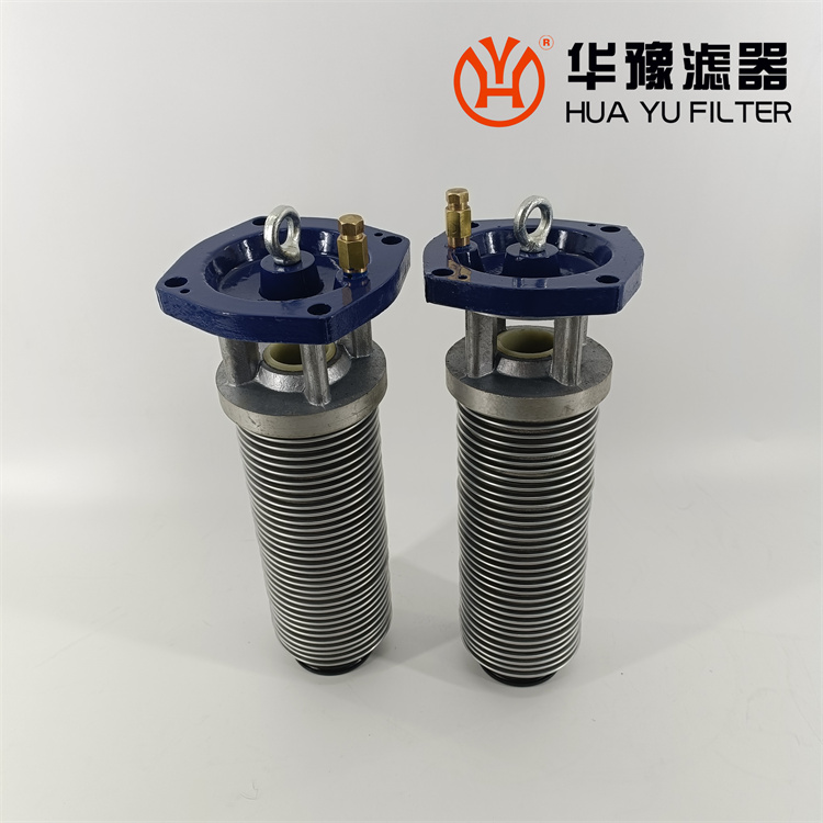 每一濾芯組件由濾器蓋、濾芯套筒、濾片及濾片圈等組成,濾器蓋頂部裝有放氣閥,供排出濾器內腔的空氣用。 濾片套在濾芯套筒上,是濾器的主要過濾元件,由濾網,支承網及波紋隔盤等組成,濾網的網目數由用戶根據需要選用。轉換閥體是由鑄鋁鋁合金制成的椎體,與閥孔研磨配合,閥體上鑄有上下兩油道孔,上油道孔一端通濾芯上方油腔,一段通濾器出口,下油道孔一段通濾芯腔,一段通濾器進口,當轉換閥迅速從一極限位置轉至另一極限位置時,閥體將一濾芯腔的通路關閉,而將另一濾芯腔的通路打開,此時,壓力油從濾器進口流入濾芯腔,經濾網過濾后的清潔油經上方油腔從出口流出,達到濾清油液的目的。轉換閥體軸端頭上的箭頭指向接通的濾芯腔的一邊。